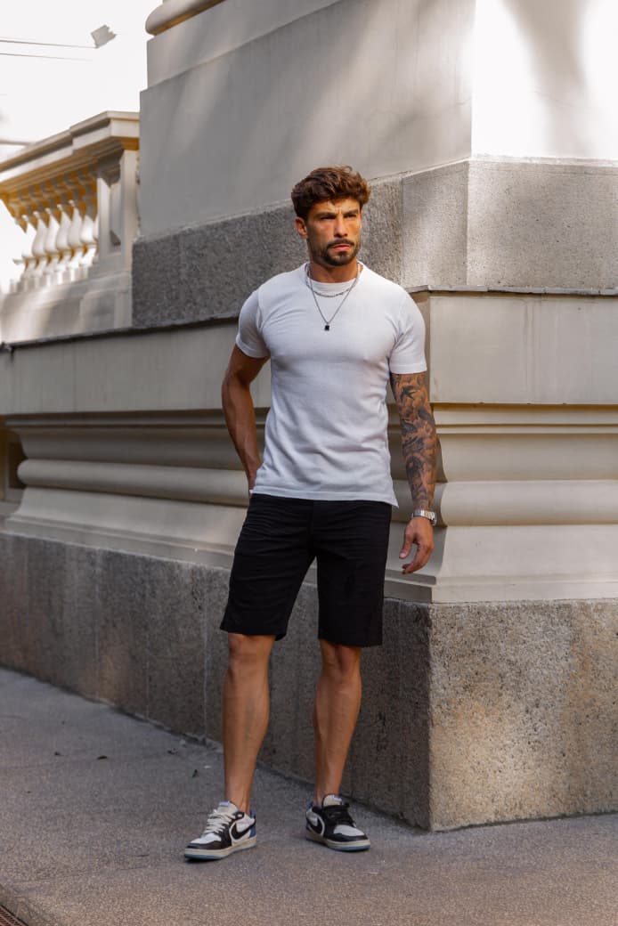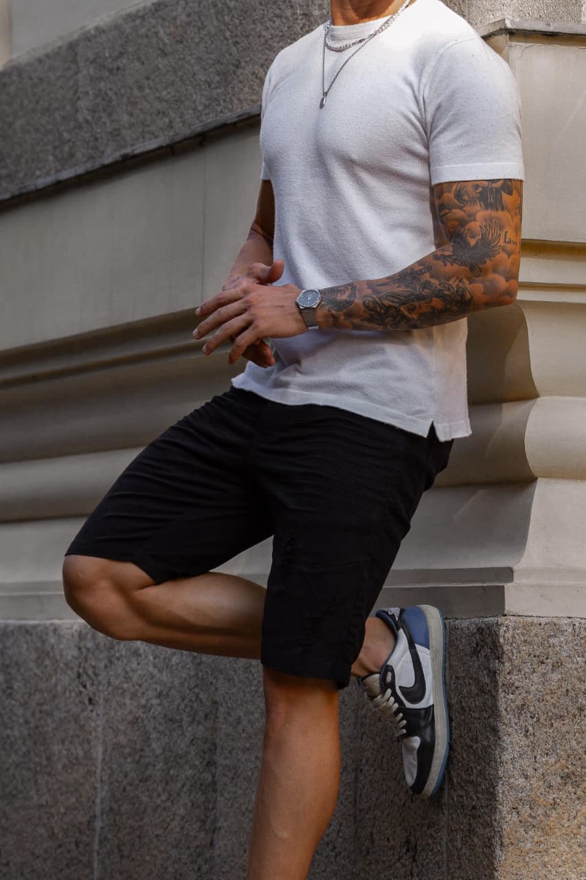 Bermuda masculina preta com pinças, confeccionada em 98% algodão e 2% elastano. Elegante e confortável, oferece caimento impecável e toque de sofisticação para looks modernos, versáteis e cheios de estilo em qualquer ocasião.