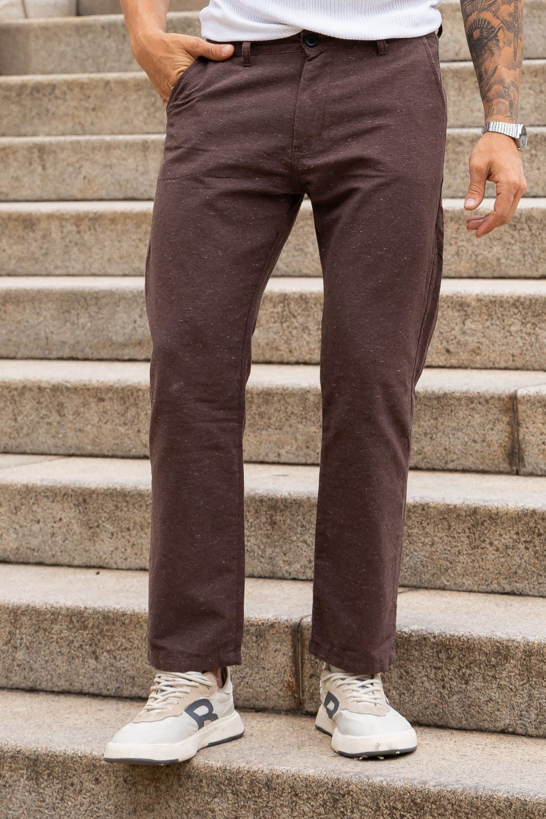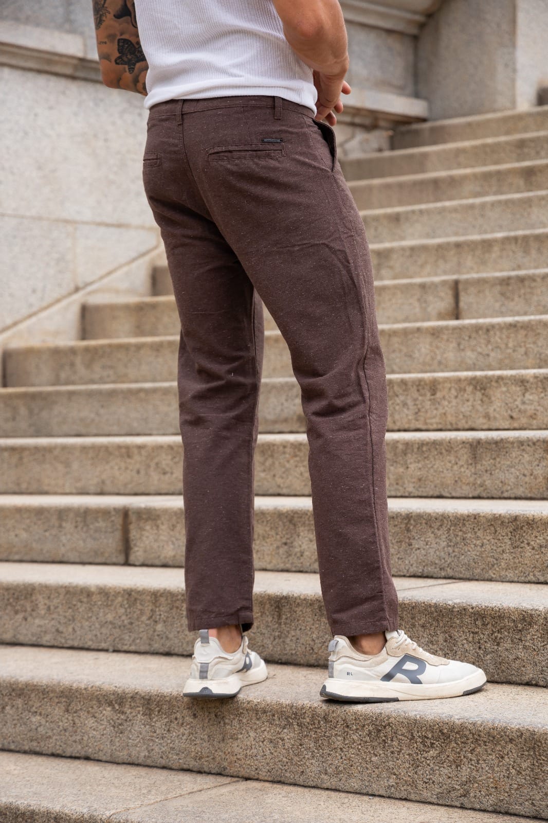 Calça alfaiataria masculina em linho na cor chocolate, unindo elegância e conforto para qualquer ocasião. Com 90% algodão e 10% poliéster, garante caimento impecável e toque macio. Aproveite os preços especiais do outlet e eleve seu estilo com sofisticação agora mesmo!