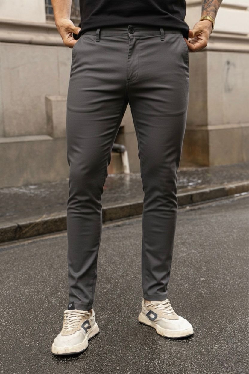 Calça alfaiataria slim masculina feita com 72% algodão, 25% elastomultiester e 3% elastano, unindo visual moderno, toque macio e elasticidade na medida certa para acompanhar sua rotina com conforto e estilo.