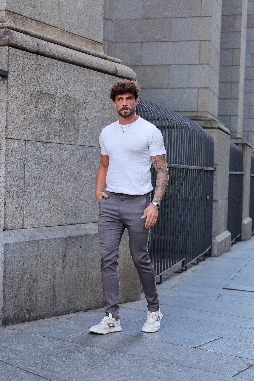 Calça alfaiataria slim masculina feita com 72% algodão, 25% elastomultiester e 3% elastano, unindo visual moderno, toque macio e elasticidade na medida certa para acompanhar sua rotina com conforto e estilo.