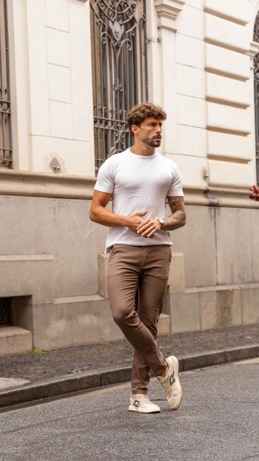 Calça alfaiataria slim masculina feita com 72% algodão, 25% elastomultiester e 3% elastano, unindo visual moderno, toque macio e elasticidade na medida certa para acompanhar sua rotina com conforto e estilo.