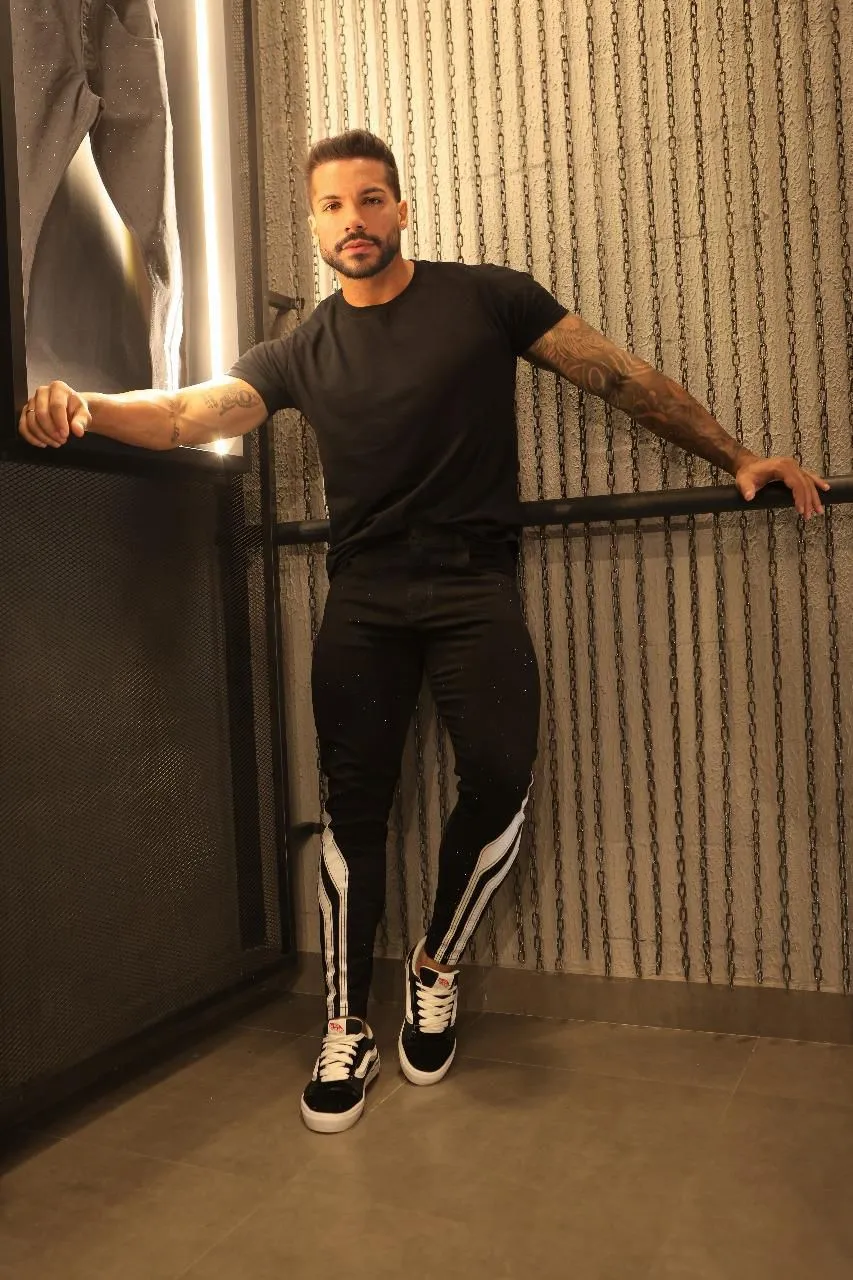 Calça jeans preta masculina com detalhes em strass que elevam o visual com brilho e personalidade na medida certa. Confeccionada em 98% algodão e 2% elastano, oferece conforto, caimento impecável e liberdade de movimento. Ideal para quem quer se destacar com estilo. Aproveite as ofertas exclusivas do outlet e garanta já a sua!