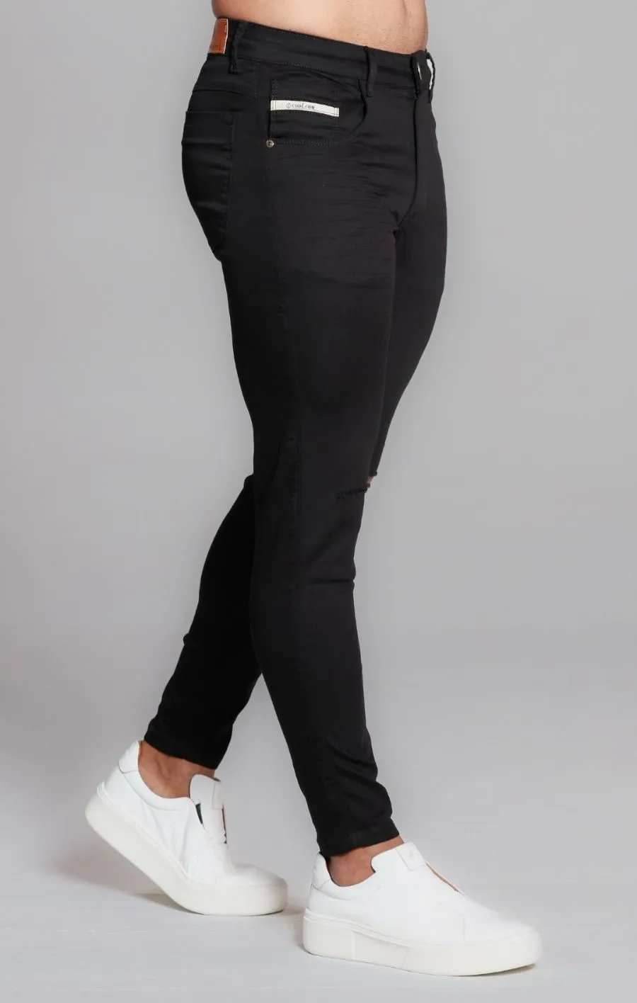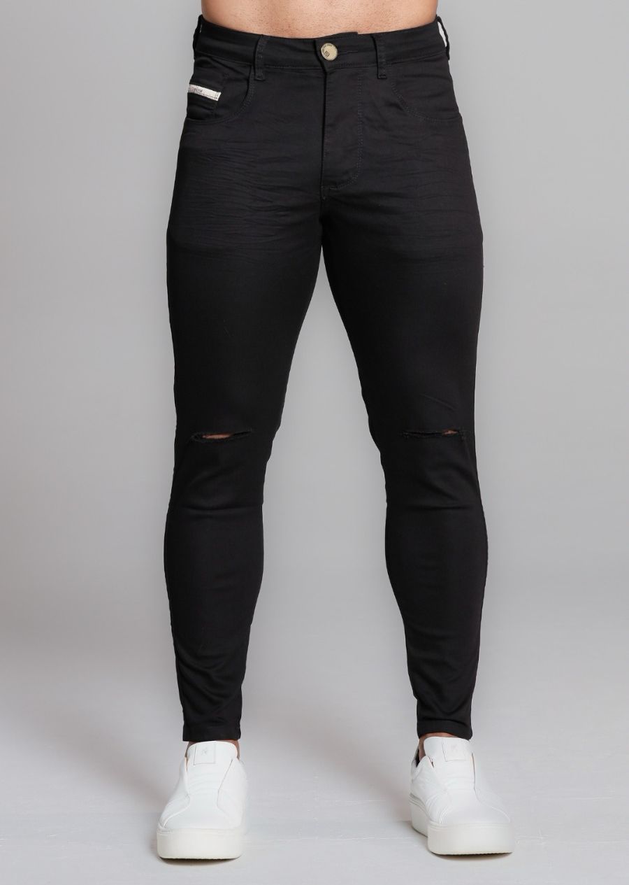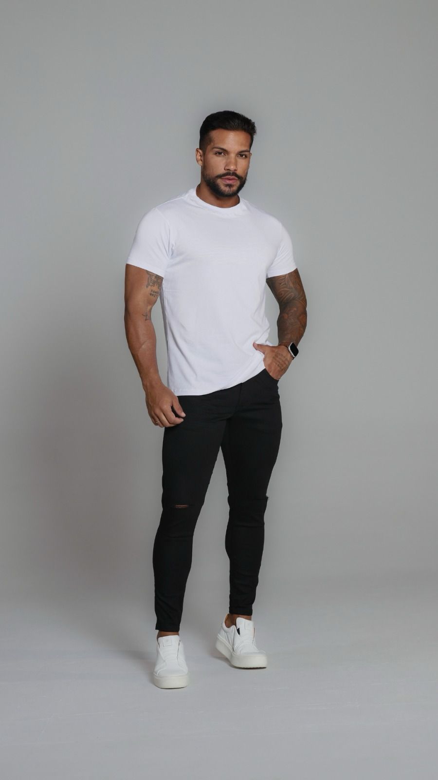Calça jeans skinny masculina preta com corte no joelho e detalhes no bolso: estilo urbano, atitude e conforto em uma peça que transforma qualquer look. Destaque-se!