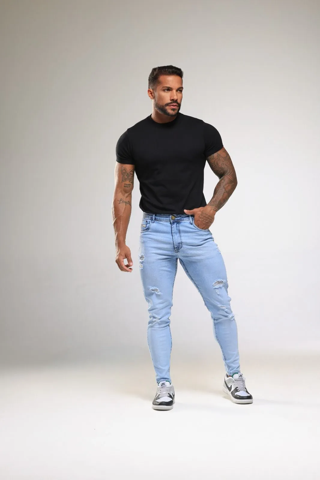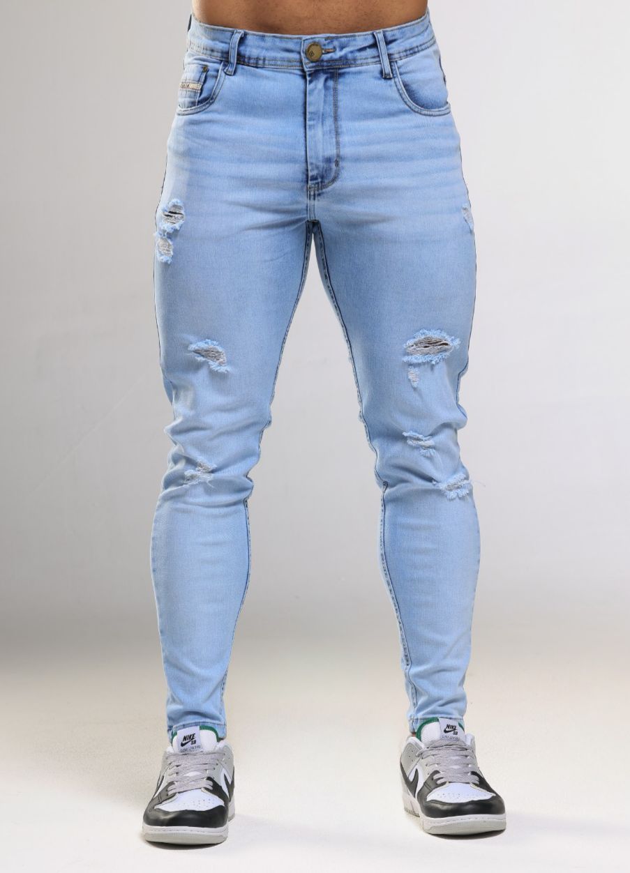 Calça jeans skinny masculina Devore com lavagem clara, rasgos e detalhes no bolso: estilo moderno, ajuste perfeito e conforto o dia todo. Ideal para looks urbanos cheios de atitude!
