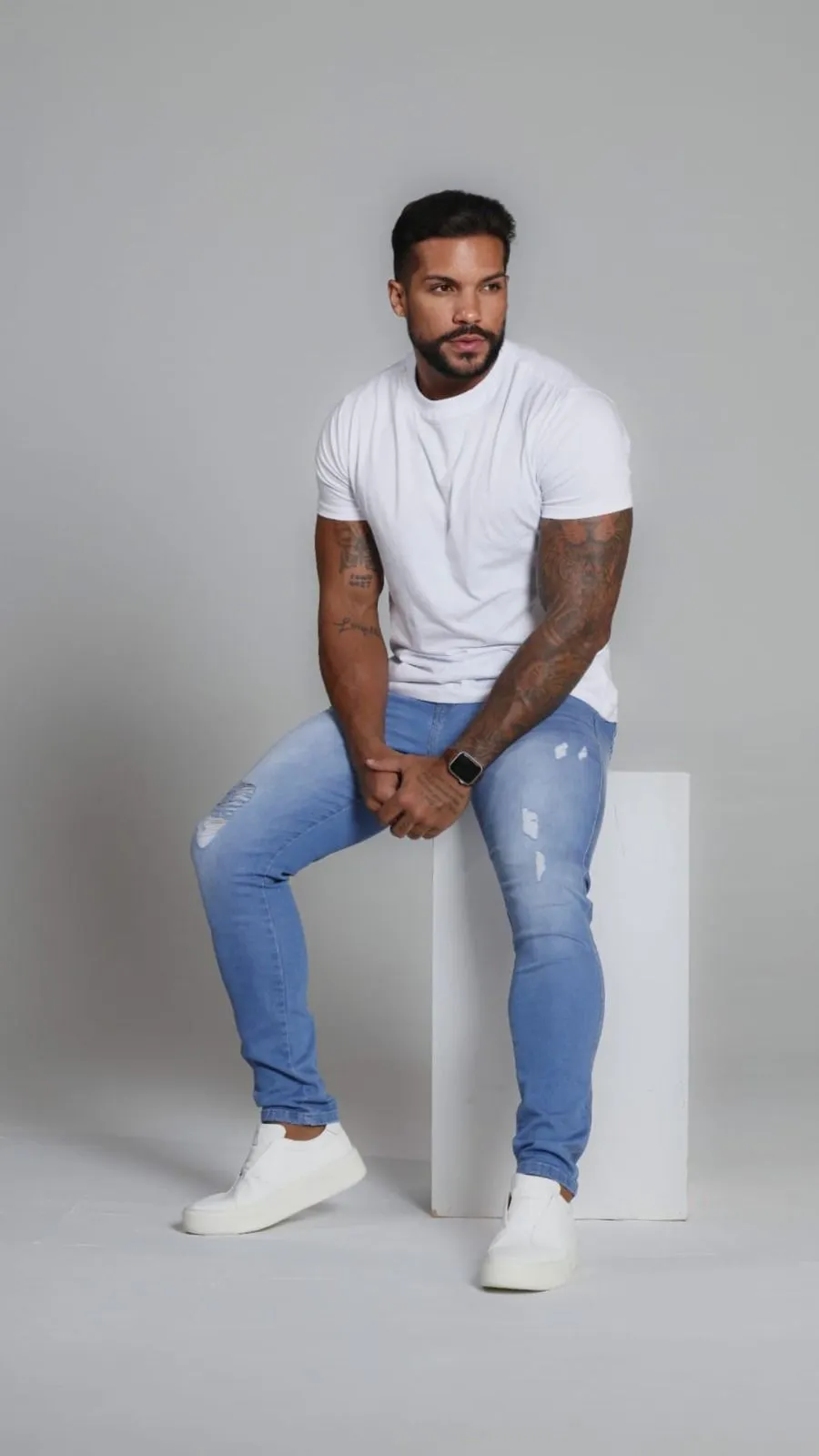 Calça Jeans Slim Masculina com Lavagem Clara e Rasgos a Laser, confeccionada com 98% algodão e 2% elastano para oferecer conforto, elasticidade e caimento perfeito. Com estilo moderno e detalhes que destacam atitude e personalidade, é a escolha ideal para quem busca looks urbanos e cheios de estilo.